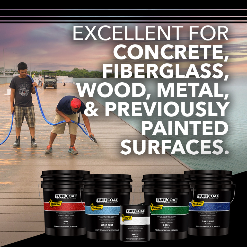 Tuff Coat’s flexible finish dries to 30-35 mils of thickness creating a finish that hides significant imperfections on all surfaces as well as improves existing non-skid finishes to provide additional safety. This product is low odor and should be applied with a Tuff Coat roller or low-pressure hopper spray gun.