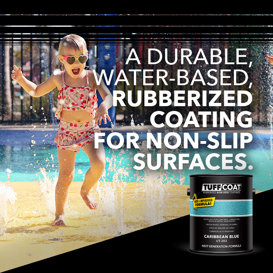 Tuff Coat is a single component, flexible, water-based non-skid coating created through a unique process of cross-linking urethanes, acrylics, co-polymers and recycled rubber granules to create a long-lasting non-slip finish. This product is designed to provide an attractive, highly durable, impact-resistant, non-slip surface for splash pads, kiddie and wave pools, spray parks, restroom floors, deck surfaces, natatoriums and other areas requiring slip resistance that can be used in or out of water.